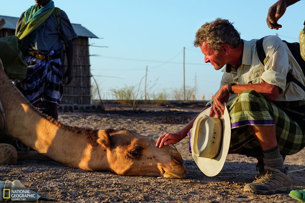 Антрополог Канро Кайранто арғы аталарымыздың сүйектері мен құрал-саймандарын іздеп жатыр. Херто-Бури маңы. Бұл Пол Салопектің әлемдік саяхатын бастаған жері. Пол Салопек суреті. Аурта түйенің әбден шаршаған сәті. Ол басын сипалату үшін төмен түсірді.